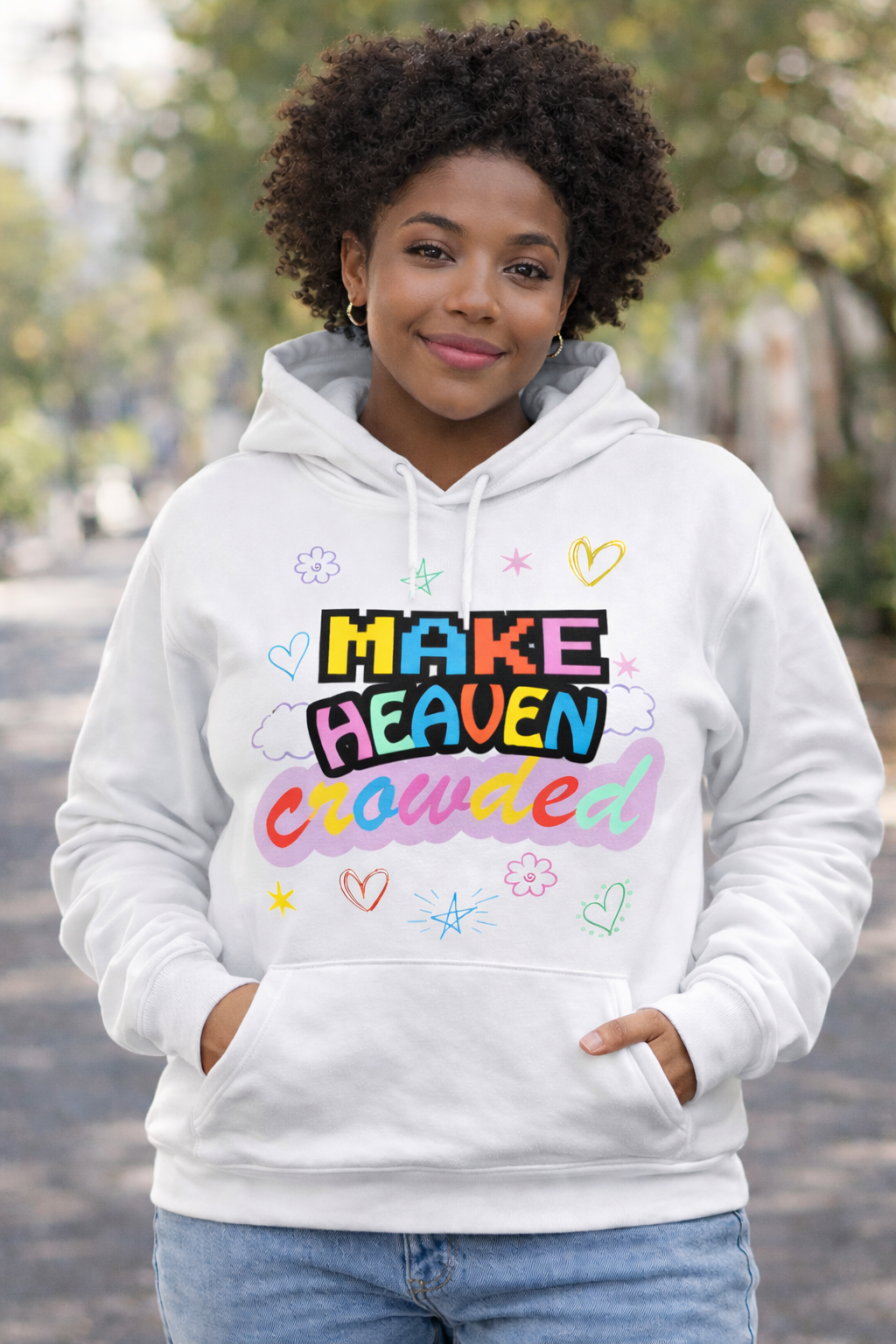 Wrap yourself in comfort and purpose with our “Make Heaven Crowded” Unisex Hoodie. Designed to inspire conversation and connection, this hoodie features bold, colorful lettering that radiates joy, faith, and hope—because style can speak life, too.