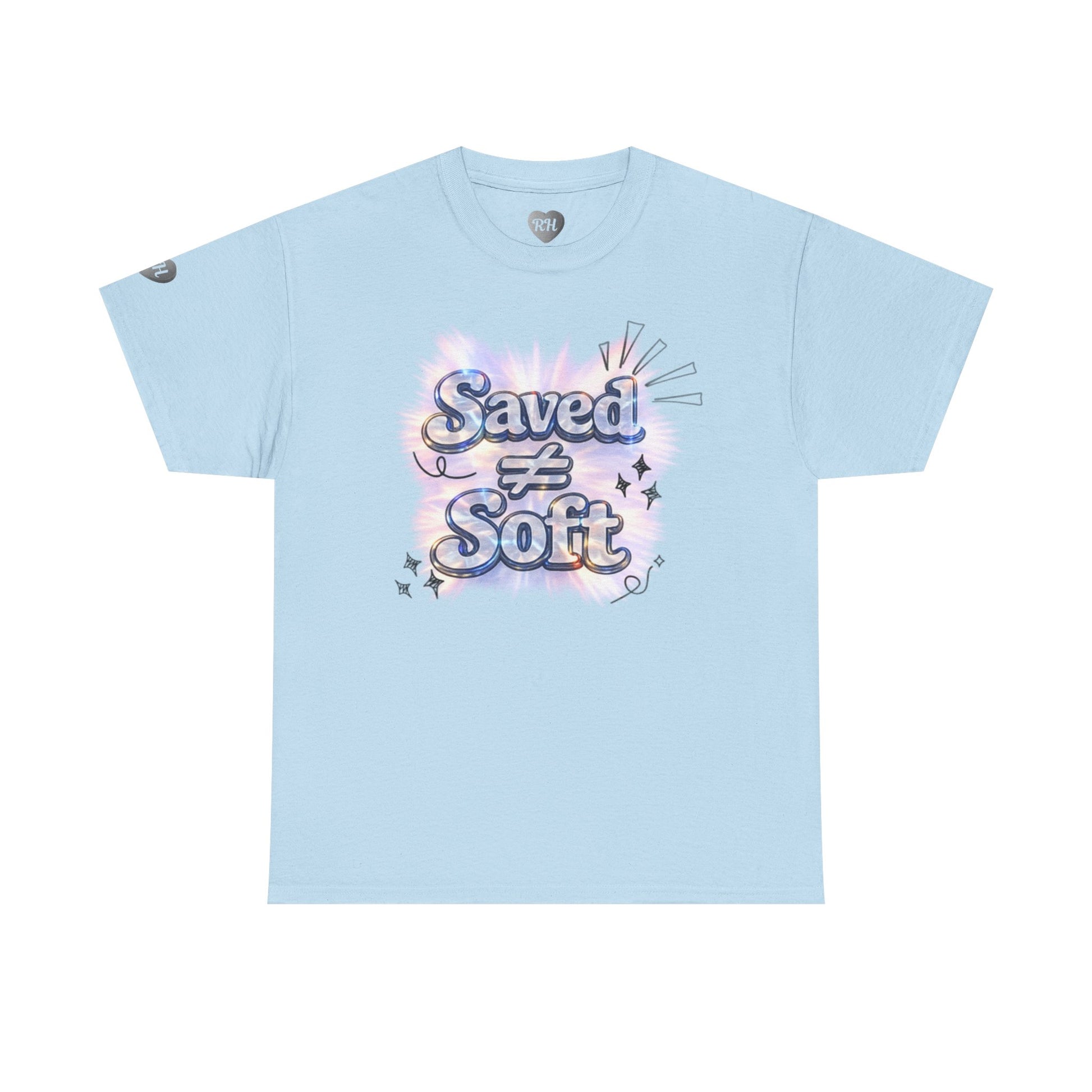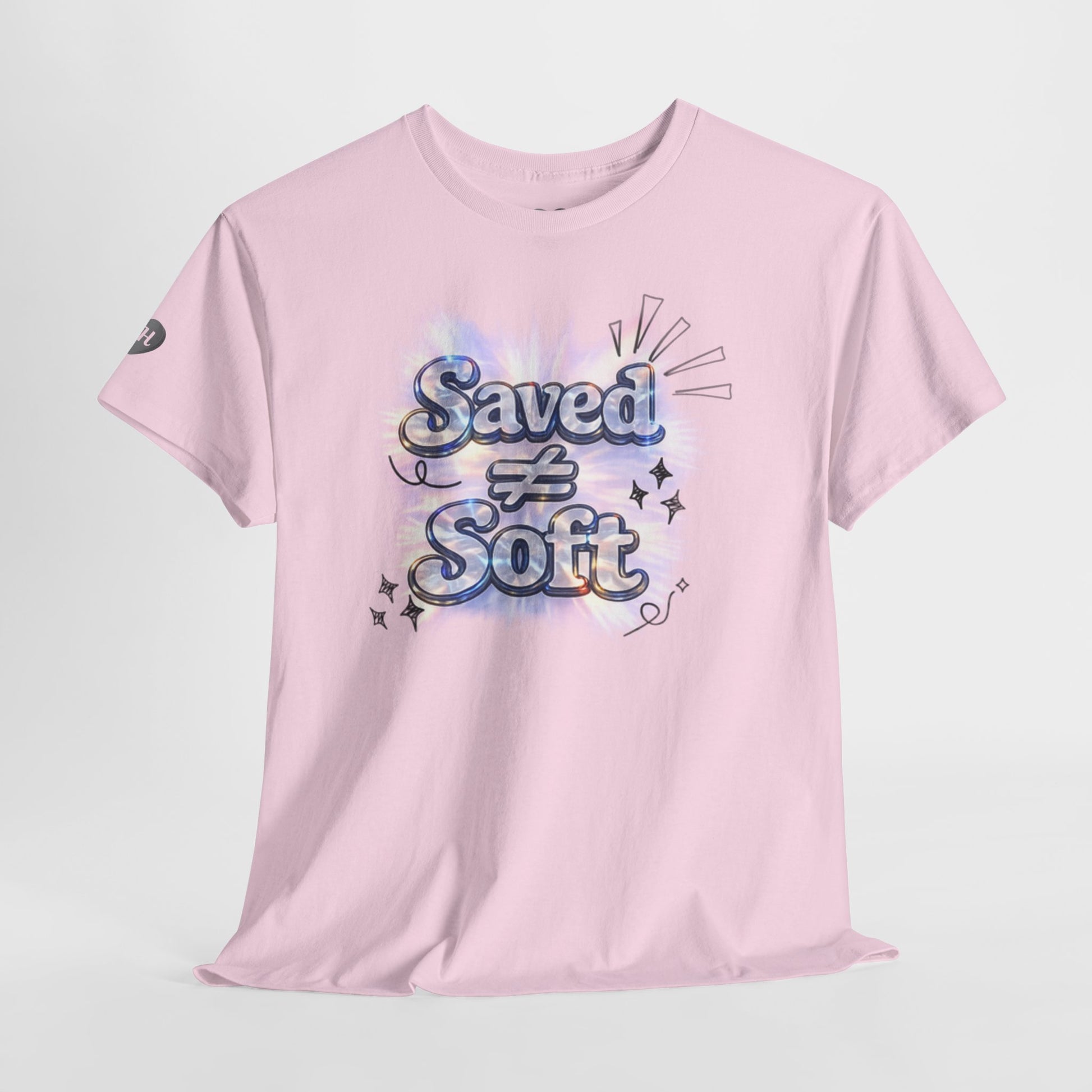 A soft, casual tee with a bold, heartfelt message. Light cotton feels gentle against the skin while the center artwork—playful, pastel lettering reading “Saved ≠ Soft” with starbursts and cloud-like shading—makes a quiet but confident statement. Wear it layered under a denim jacket or loose over leggings; it carries warmth and conviction without shouting. The roomy, classic cut moves with you through volunteer shifts, church hangouts, worship nights, or coffee runs with friends. It’s for people who want a gentle aesthetic and an honest message—subtle, spirited, and sincere.